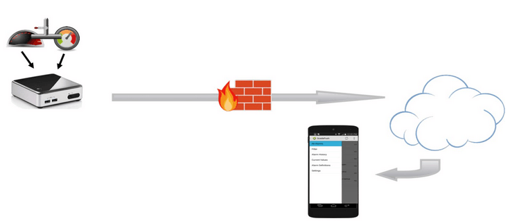 如图1所示,ScadaPush的硬件组成包括现场设备、工业电脑和一个运行于智能手机或平板电脑的APP应用程序。设备连接到自动化系统局域网(LAN)并通过云与远程APP进行通信。该系统支持多个不同的数据采集协议,包括MODBUS RTU/ASCII、Modbus TCP、GE-EGD/SRTP、Allen-Bradley CIP和EtherNet/IP。